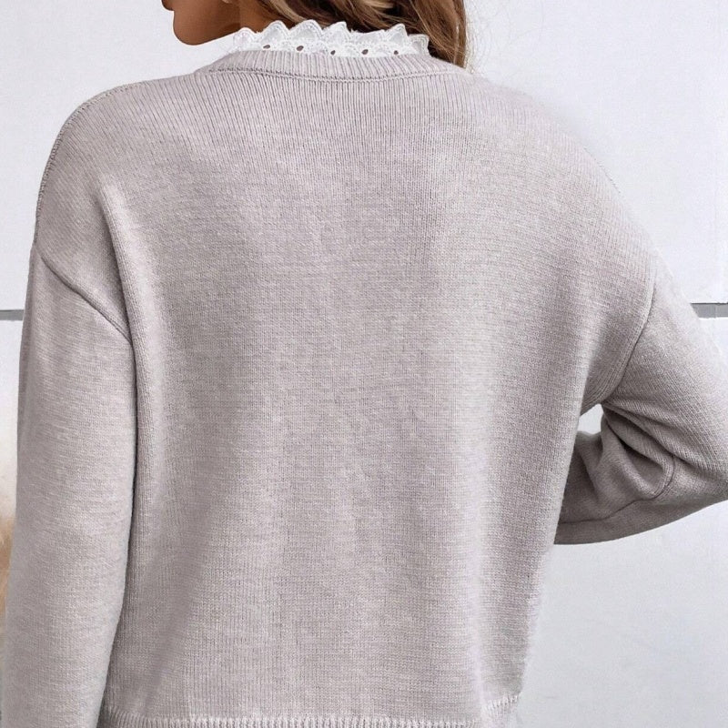 ✨Damska dzianinowa bluzka z dekoltem w serek i koronkową lamówką